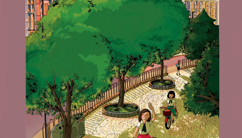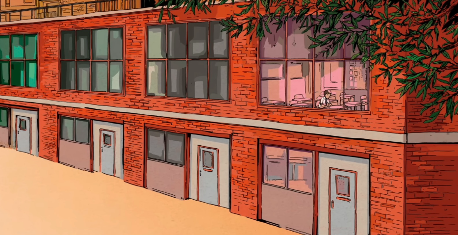 쉬는 시간에 해가 나자, 요시오는 자기가 아는 가장 조용한 곳으로 갔습니다— 운동장 가장자리에 있는 대나무 숲이었습니다. 하지만 거기에서도, 대나무는 바람이 줄기를 부딪치며 “타케-타케-타케” 하는 소리를 냈습니다.