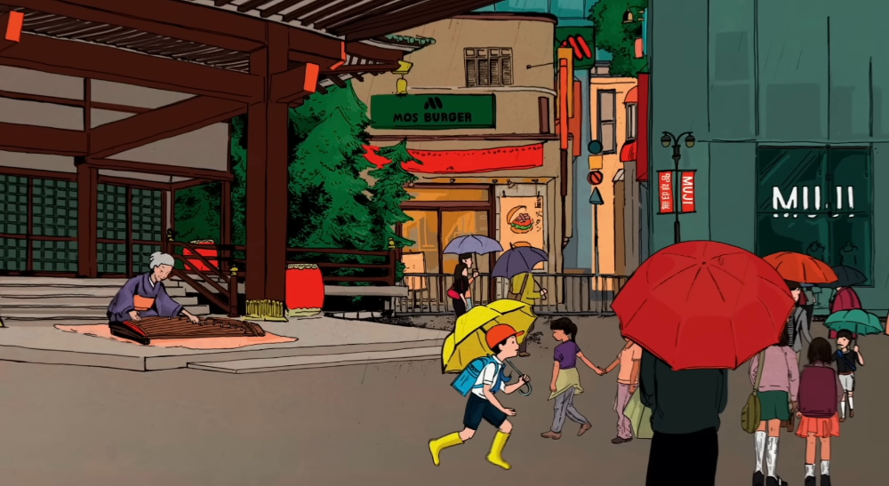 Little Yoshio wiggled with anticipation. Three…two…one! He threw open the front door. The sounds of the city swirled all around him— Tokyo was like a symphony hall! Yoshio listened to the sound of his boots squishing and squashing through the puddles, and the tiny raindrops pattering on his umbrella. The sound of his giddy giggles made him giggle even more.