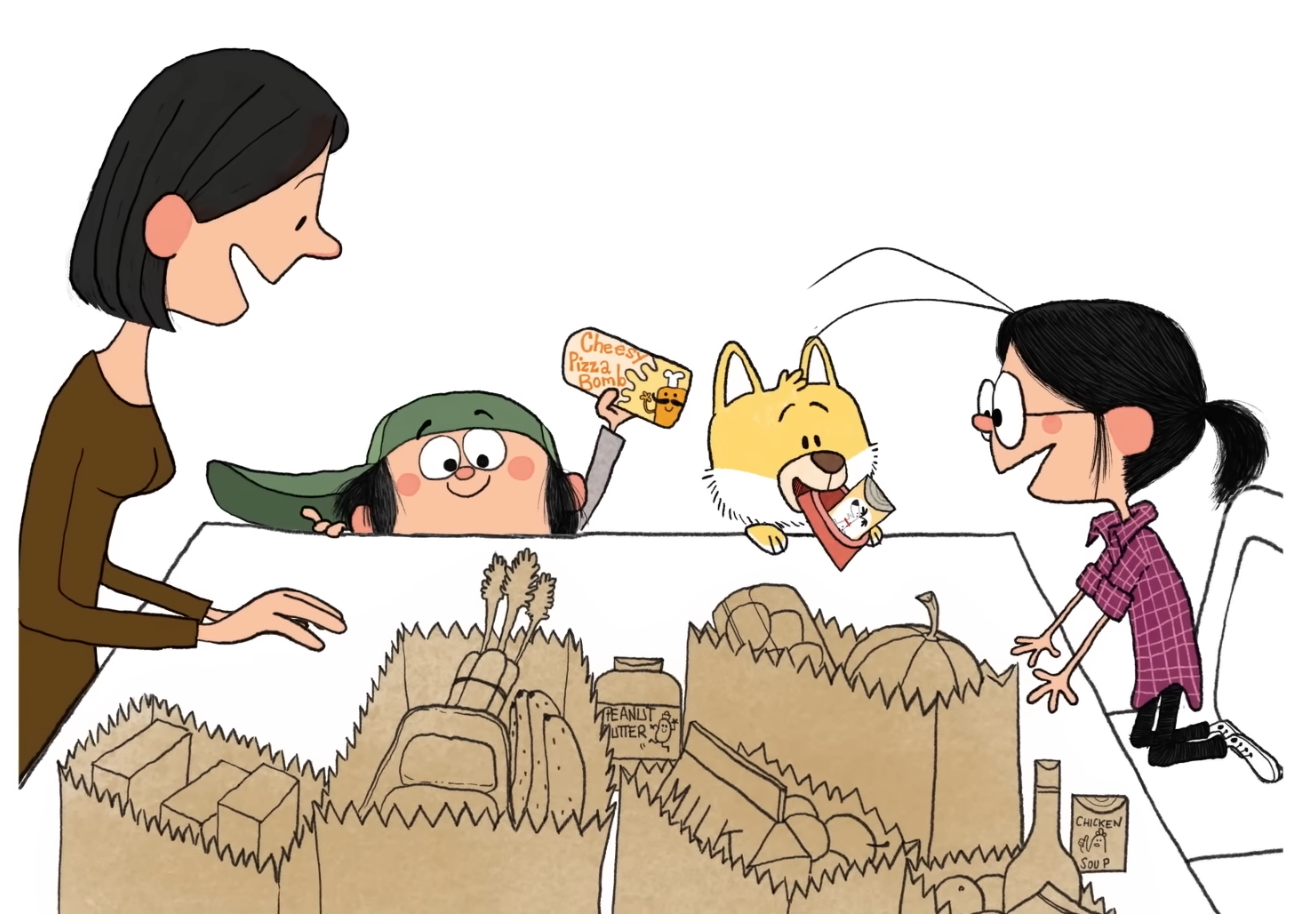 그들은 장바구니에 우유, 밀가루, 닭고기, 당근, 설탕, 기름, 심지어 냉동 고기와 채소까지 담았습니다. 루이스는 냉동고에서 치즈 피자 폭탄을 꺼냈습니다. 그는 한참을 생각하고 생각하고 좀 더 고민하더니, 치즈 피자 폭탄을 매디와 라이언의 봉지에 넣었습니다.