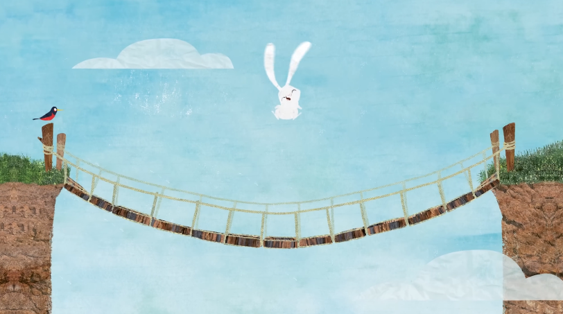 토끼는 다리의 한가운데로 가서 생각했어요. “봐, 이 다리는 위험하지 않아. 좋은 다리야.” 그걸 증명하려고 토끼는 위아래로 폴짝폴짝 뛰기 시작했죠. 그리고 더 세게 뛰었어요. 그리고 평생 한 번도 그렇게 세게 뛴 적이 없을 만큼 세게 뛰었죠.