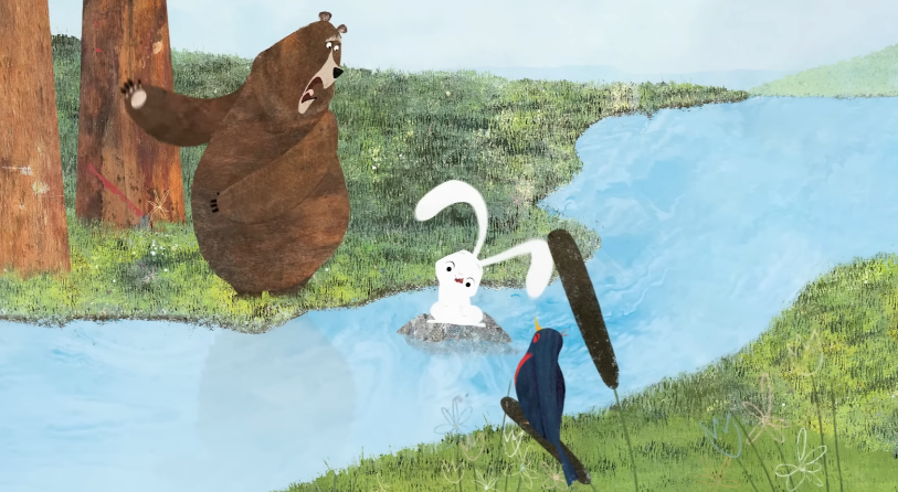 새가 포기하려던 찰나, 문 손잡이에 매달린 방울이 눈에 띄었어요. 새는 머리를 방울 속에 쑥 넣고 온 힘을 다해 흔들었어요. 곰은 놀라 침대에서 벌떡 일어났어요. 그러자 새가 외쳤습니다. “토끼가 다리에서 떨어졌어요! 당신의 도움이 필요해요!”