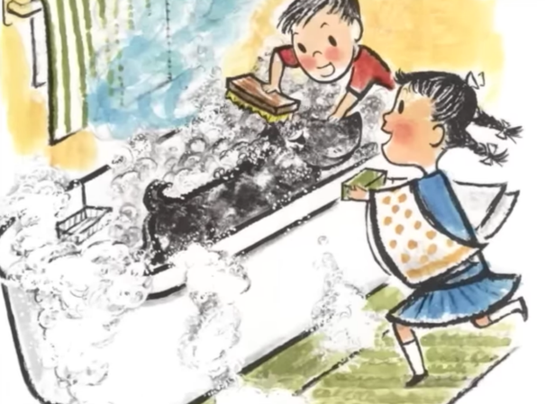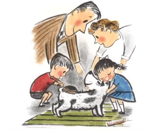 “이 강아지 목욕하고 싶대요!” 소녀가 외쳤어요. 아버지는 말했어요. “그래, 너랑 오빠가 목욕시켜 주렴.”